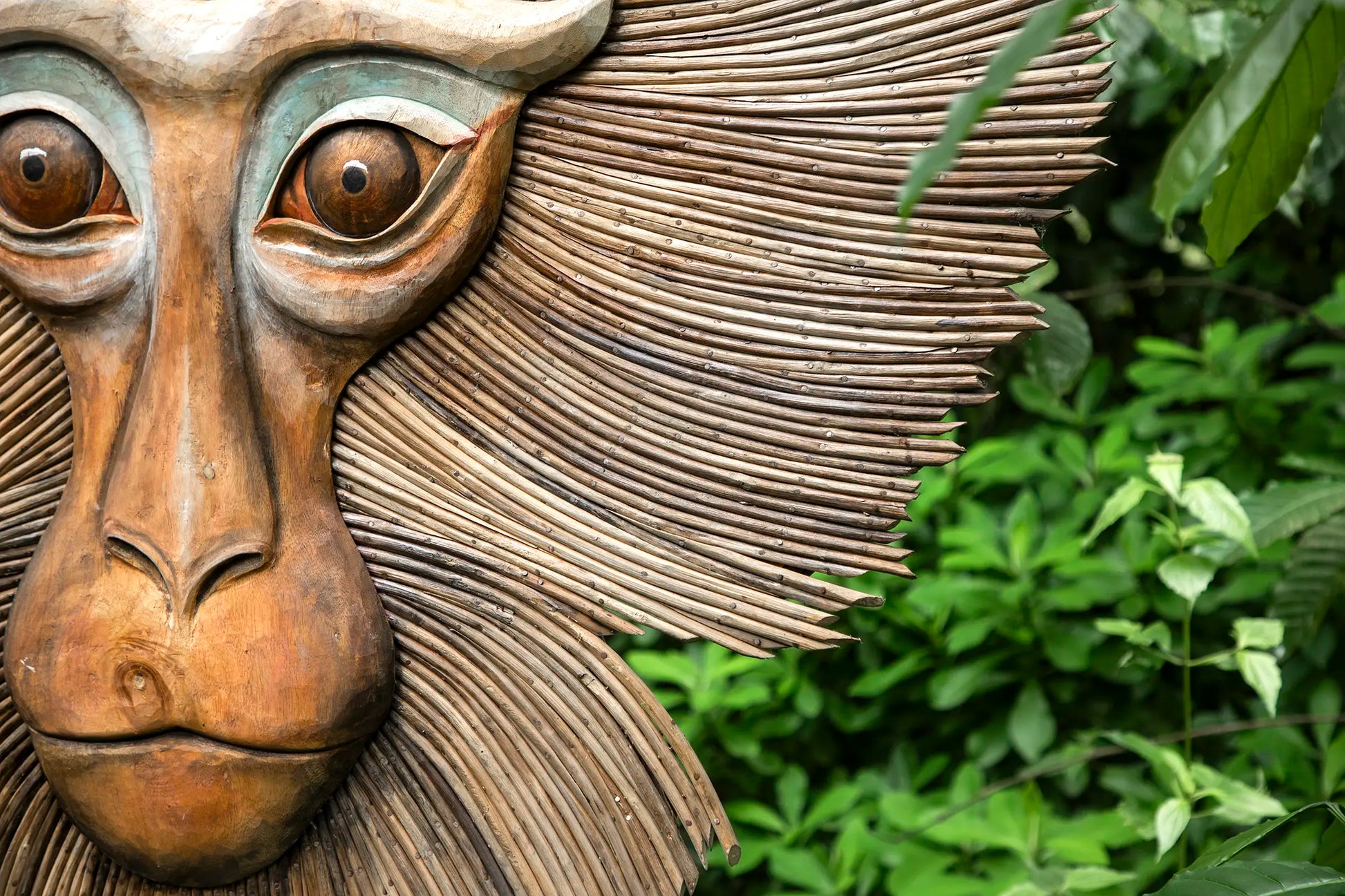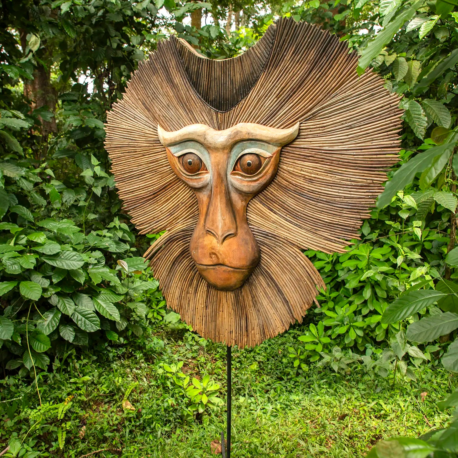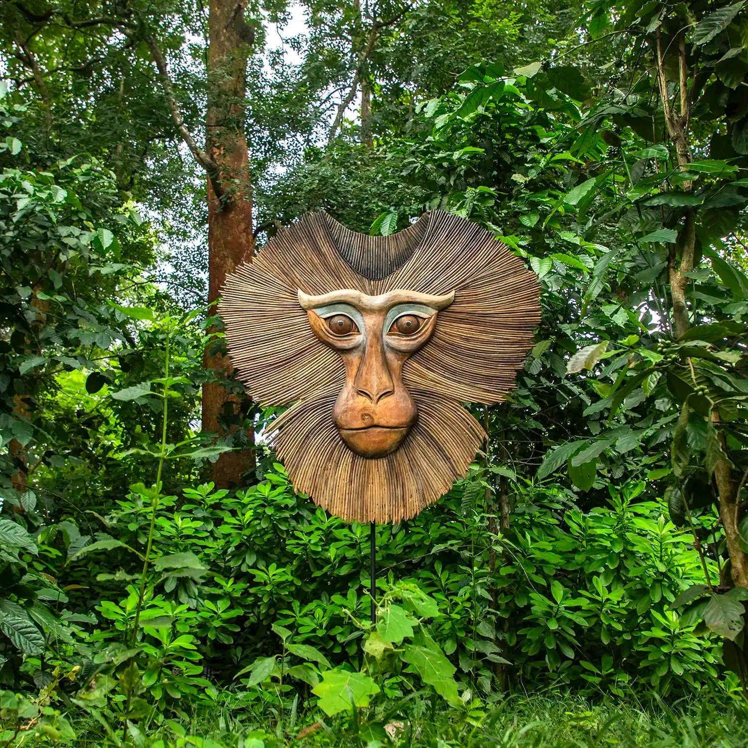 This hand-carved sculpture honors their quiet adaptability. Each piece combines stems and timber from invasive Lantana and Senna, shaped by skilled artisans to capture the macaque's expressive features.
